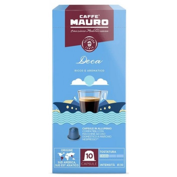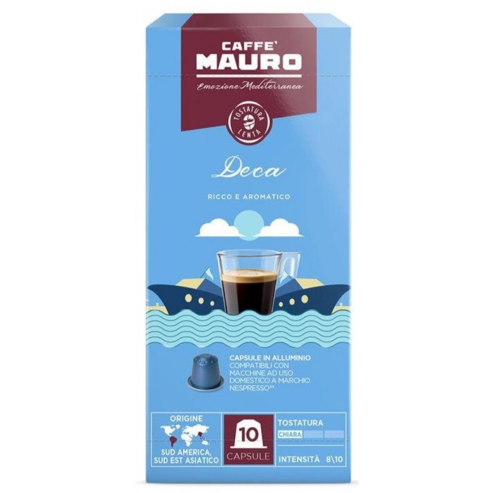 Caffè Mauro Deca Ricco e Aromatico — это высококачественный декофеинизированный кофе в алюминиевых капсулах, совместимых с системой Nespresso, созданный для тех, кто хочет наслаждаться насыщенным вкусом и ароматом классического итальянского эспрессо без кофеина.